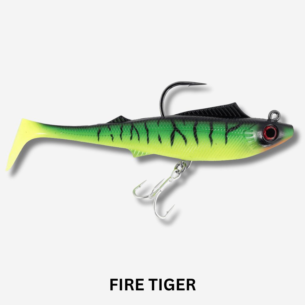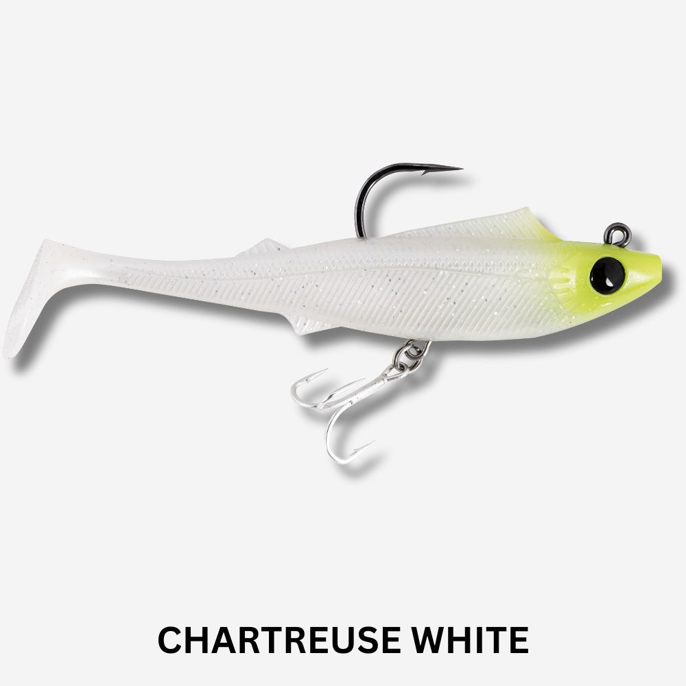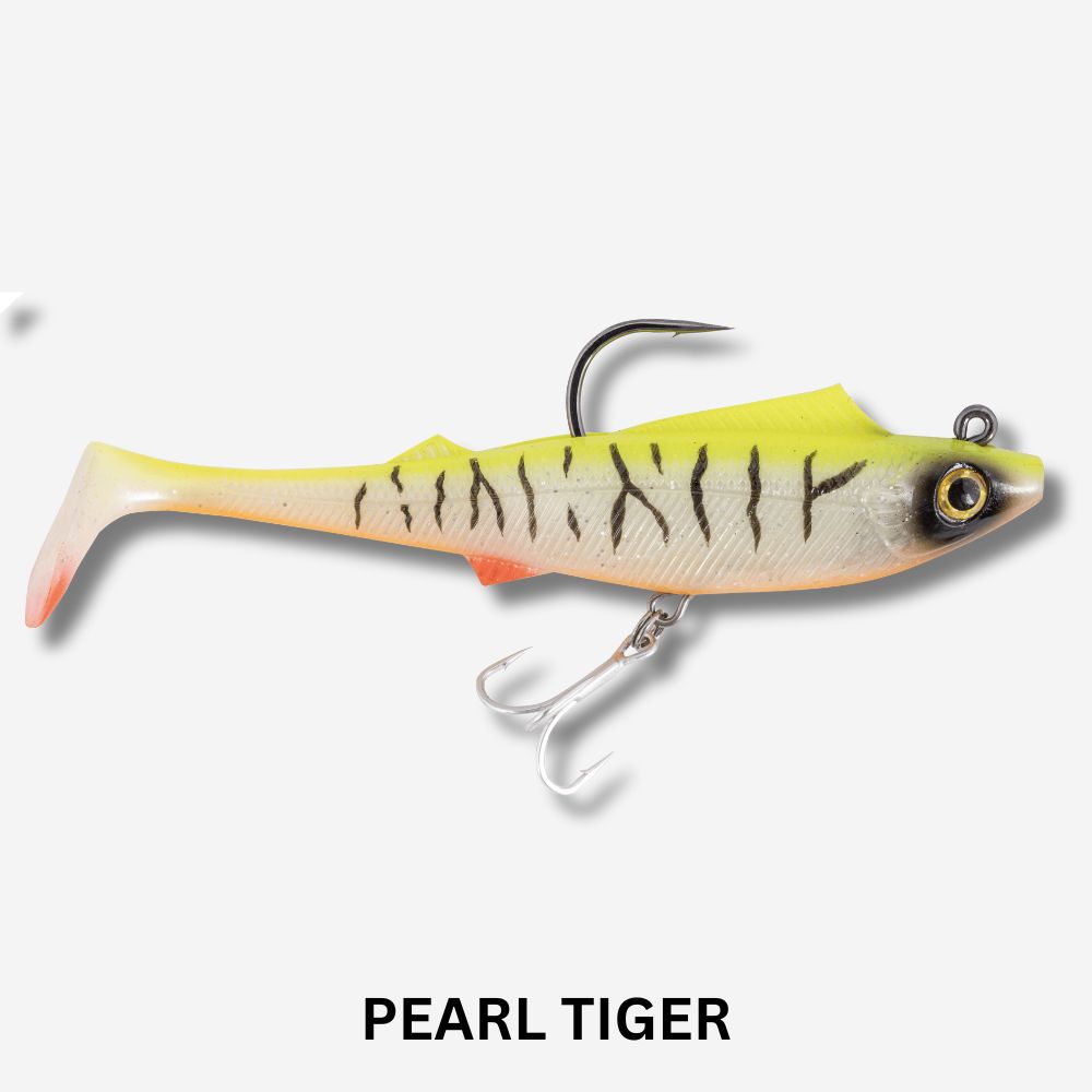 The Berkley Shimma Pro-Rig is built for big fish that pull hard. Fitted with a removable weighted hook and a single Owner STX Taff Wire Treble and a Hyperwire split ring, this bait is an out-of-the-packet solution for prized fish like mulloway, barramundi and Murray cod. With a thick body profile and a tapered off paddle tail, the Shimma Pro-Rig has a strong body roll and a wide tail action, perfect for slow rolling across weed beds, rock bars, and drop offs for those ambush predators. Built from durable Thermal Plastic Elastomer (TPE), the body is super tough and withstands plenty of punishment from predators with serious jaw strength, and raspy or toothy mouths! The Shimma Pro-Rig is available in ten colours and three sizes to suit a wide range of species in both fresh and saltwater environments. Every angler hunting serious fish needs a Shimma Pro-Rig in the tackle box.