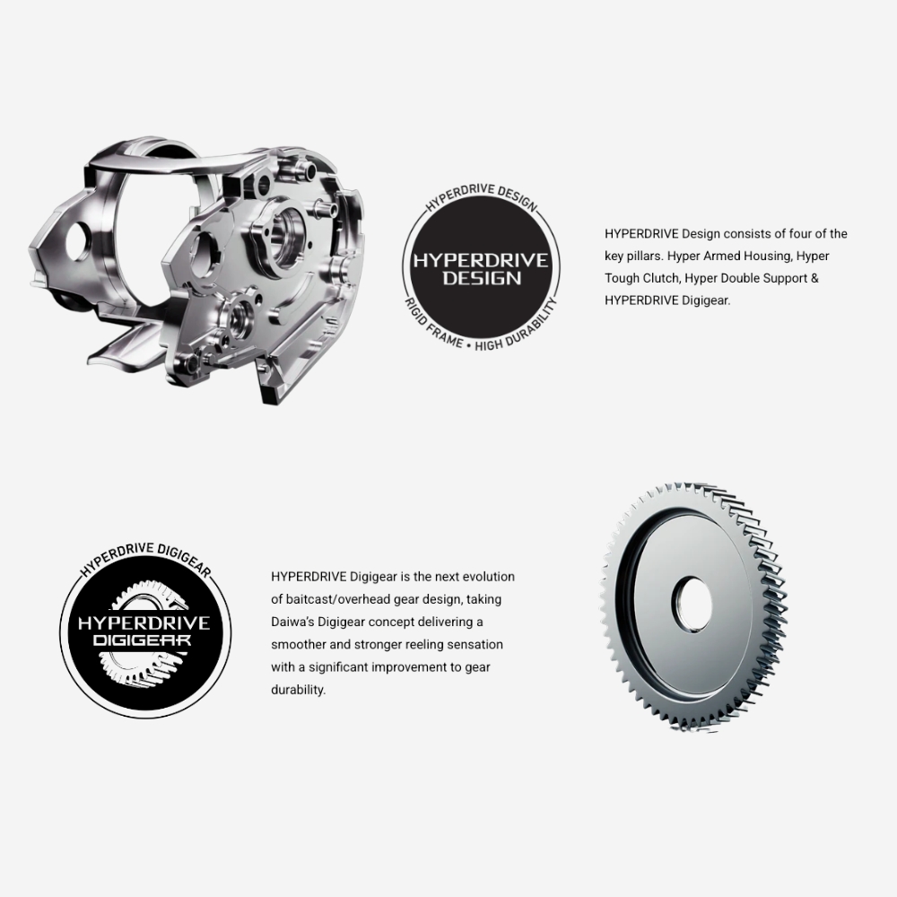 Supporting a “reeling style” that never fades, RYOGA continues to uphold its legacy. Building on the high-precision, high-rigidity machine-cut housing “HYPER ARMED HOUSING” that has been a hallmark of past RYOGA models, this reel also incorporates the “HYPERDRIVE DIGIGEAR” system. The synergistic effect of these technologies eliminates almost all play while delivering a silky-smooth yet powerful winding performance.
