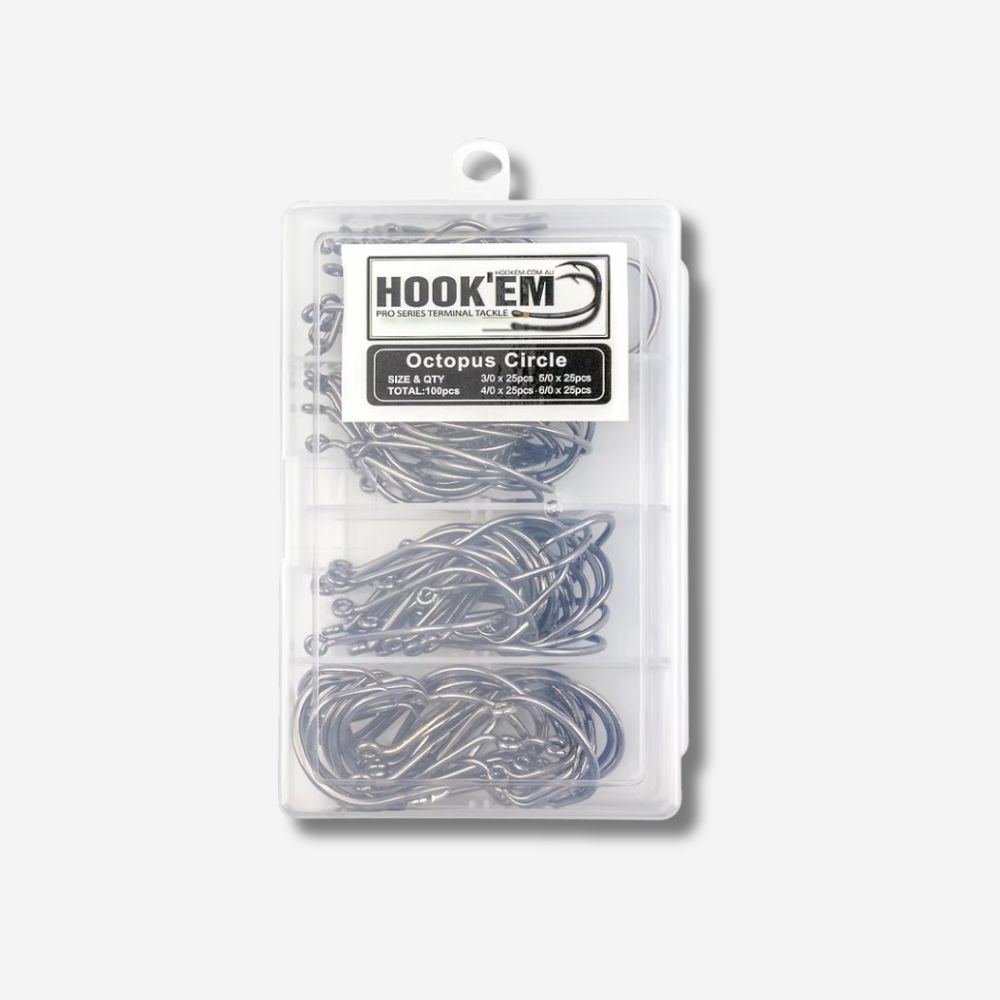 Hook'em Octopus Circle Hooks are black nickel coated high carbon steel, chemically sharpened to a tack sharp point.