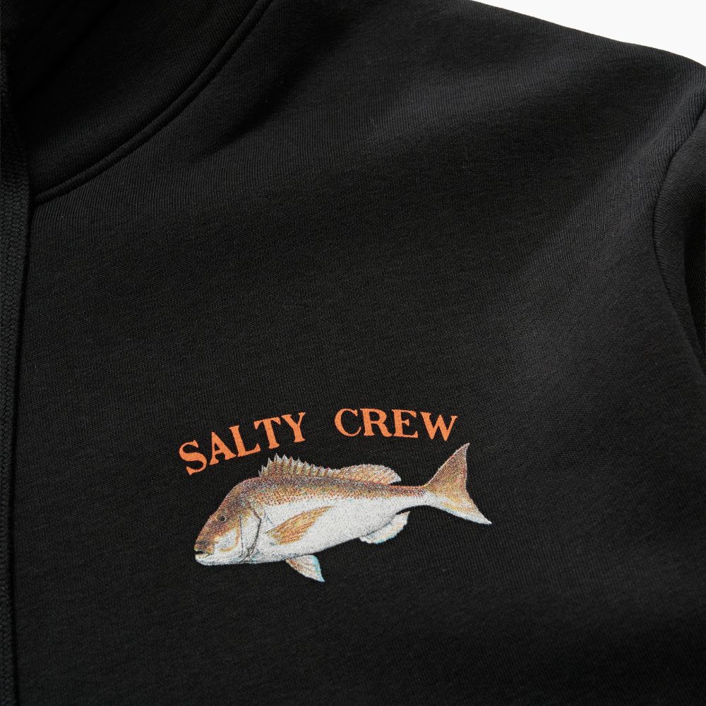 Snapper Hood in Black is made from our signature mid-weight Cotton/Polyester Brushed Fleece, 380gsm in weight. Featuring two-piece hood with encased drawcord, rib knit cuffs & hem, self-fabric kanga pocket & Salty Crew clamp label at hood opening. Digital Printed front and back prints.